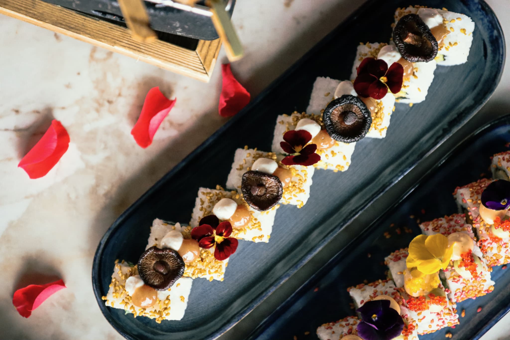 The experience unfolds with a delectable sharing menu, starting with fresh oysters, followed by an elegant selection of sushi, indulgent bites like teriyaki chicken, gyoza, bread selection with smoked butter and dynamite shrimps, finishing with a stunning sharing dessert paired with 2 Espresso Martini.